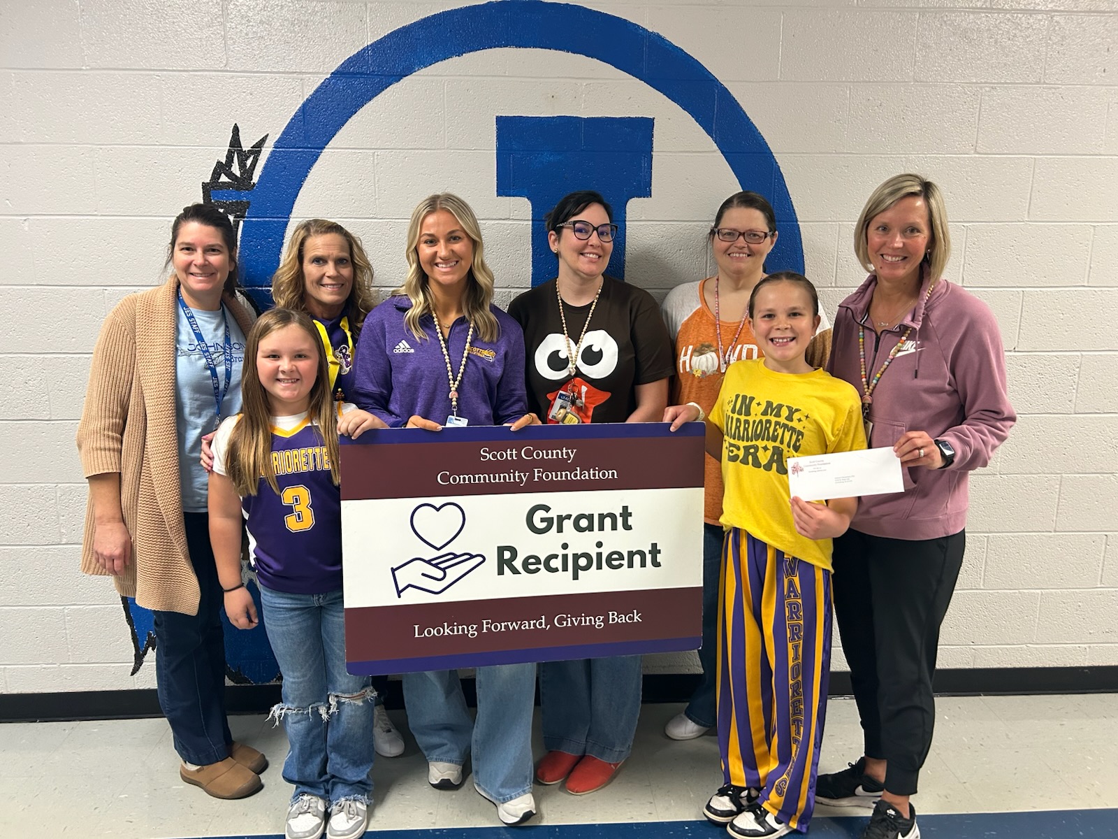Scott County Community Foundation Executive Director Jaime Toppe, far right, presents a check for $250 to Scottsburg High School Principal Jeff Cox and teacher Melissa Lyles. The grant was awarded from the Scottsburg High School Classroom Innovation Fund at the Scott...
