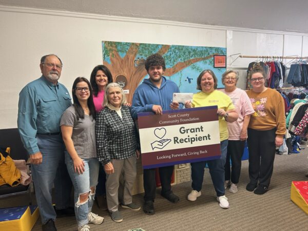 The Wolf family presents a check for $3,000 to Cradle Family Resource Center. The grant was awarded from the Wolf Family Charitable Fund at the Scott County Community Foundation. Shown from left to right are Joe Wolf, Sonya King, Tammy Wolf, Becky Wolf, Michael Wolf; CRADLE Executive Director Erin Manton, board member Paula Baldwin, and Associate Director Hailey McClain. Cradle provides families with essentials such as diapers, pull-ups, wipes, formula, clothing, hygiene products, and other everyday necessities.