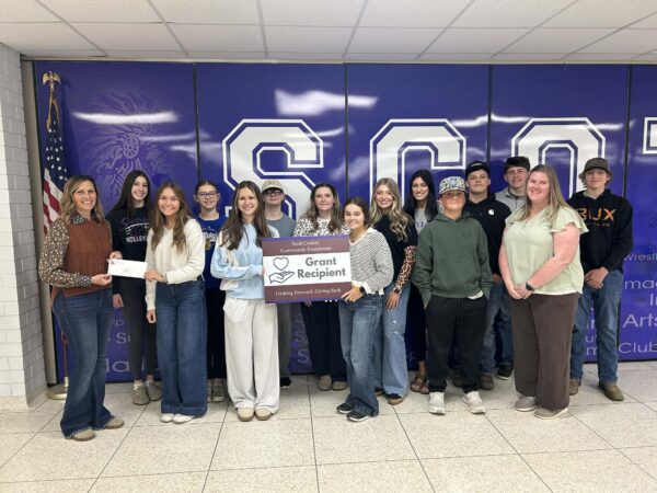 Scott County Community Foundation board member Jennifer Coward, far left, presents a check for $600 to Scottsburg FFA class members and teacher Anna Abbott. The grant was awarded from the Cornhuskers/FFA Agricultural Fund at the Scott County Community Foundation and will be used for scholarships. This is the first-ever grant awarded from the fund, which was created in 2022 to support FFA’s activities and mission. Donations to this fund are currently being matched 50 cents for every dollar donated, and can be made online at www.scottcountyfoundation.org.