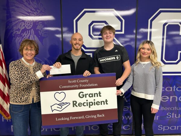 Scott County Community Foundation Board Treasurer Shari Baumann presents a check for $355 to Scottsburg High School business teacher Ian Schlosser and students JJ Montgomery and Carly Deaton. The grant was awarded from the Philip Glenn Martin Memorial Fund and will be used to support the Maverick Challenge at Scottsburg and Austin high schools. Maverick Challenge is a business planning competition where students can win cash prizes for their ideas. The competition will be held this spring. The Philip Glenn Martin Memorial Fund’s purpose is to support programs and projects that increase financial literacy and entrepreneurial skills for students. Phil Martin was the first executive director of the Scott County Chamber of Commerce.