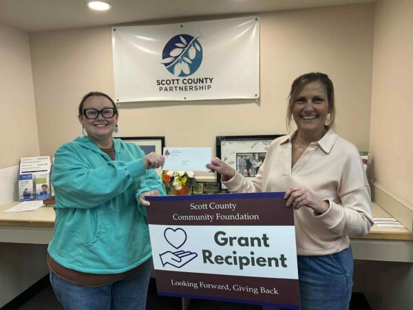 Scott County Community Foundation board member Jennifer Coward, right, presents a check for $500 to Scott County Partnership Executive Director Heather Law. The grant was awarded from the Scott County Literacy Council Fund at the Scott County Community Foundation will be used for adult education services through River Valley Resources (RVR) at the Lifelong Learning Center. RVR provides math, reading, science, social studies, and writing instruction free of charge to help adults acquire the skills needed to earn a high school equivalency diploma, go to college, or enter an entry-level occupational certification program. They also provide instruction for English language learners.